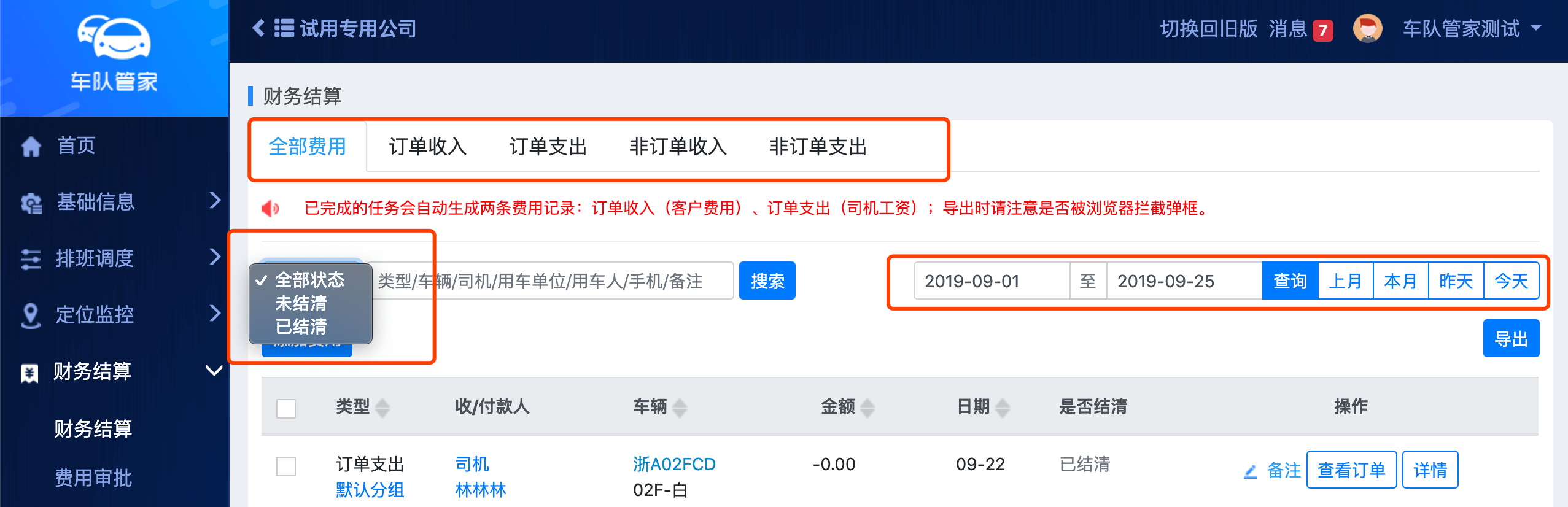 可以。可以按已结清/未结清状态进行筛选数据,也可以按订单收入,订单支出,非订单收入,非订单支出进行筛选,还可以按时间维度进行筛选。如图: