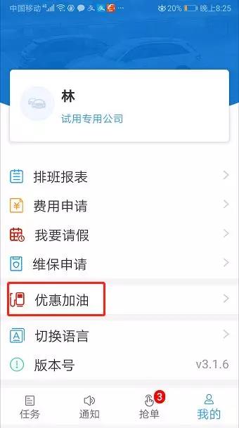 登录司机APP(司机是由各车队管理员邀请进来的哦),点击“我的”,找到“优惠加油”。