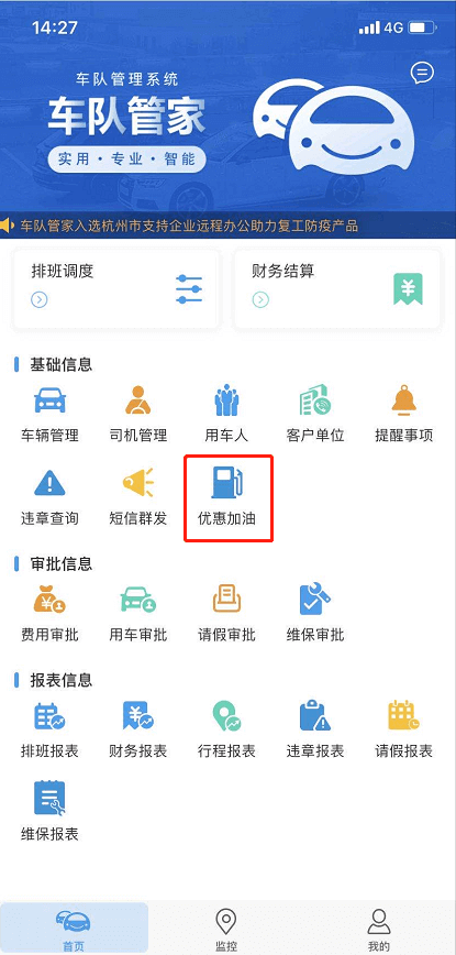 登录管理员APP,首页-基础信息,找到“优惠加油”,开始愉快的薅羊毛吧!