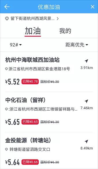 选择自己常用的油号,根据定位信息,系统自动根据位置展示附近的加油站及优惠信息。