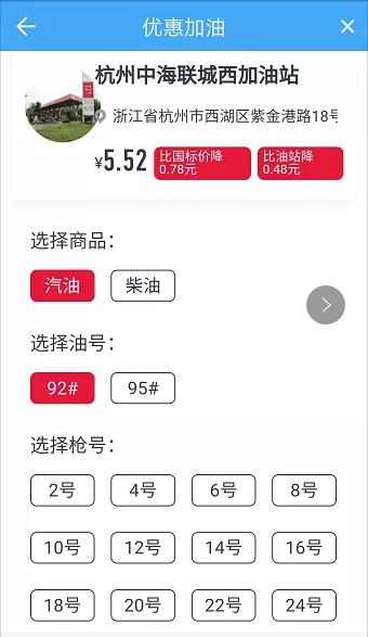 到达目的加油站后,选择所在加油站,进入后选择油号,确认枪号。