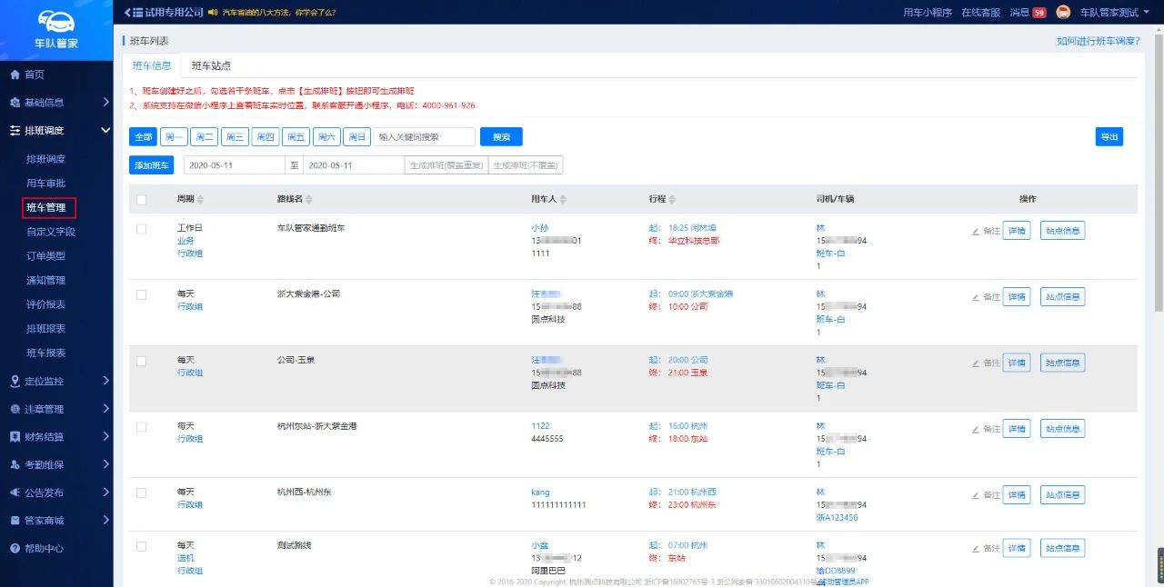 ■ 场景:管理员通过车队管家后台可以合理安排车辆,避免班车资源虚耗。 ■ 端口:网页PC端支持。 ■ 功能:添加班车,地图显示班车站点,绑定线路及相关站点,派车派司机。