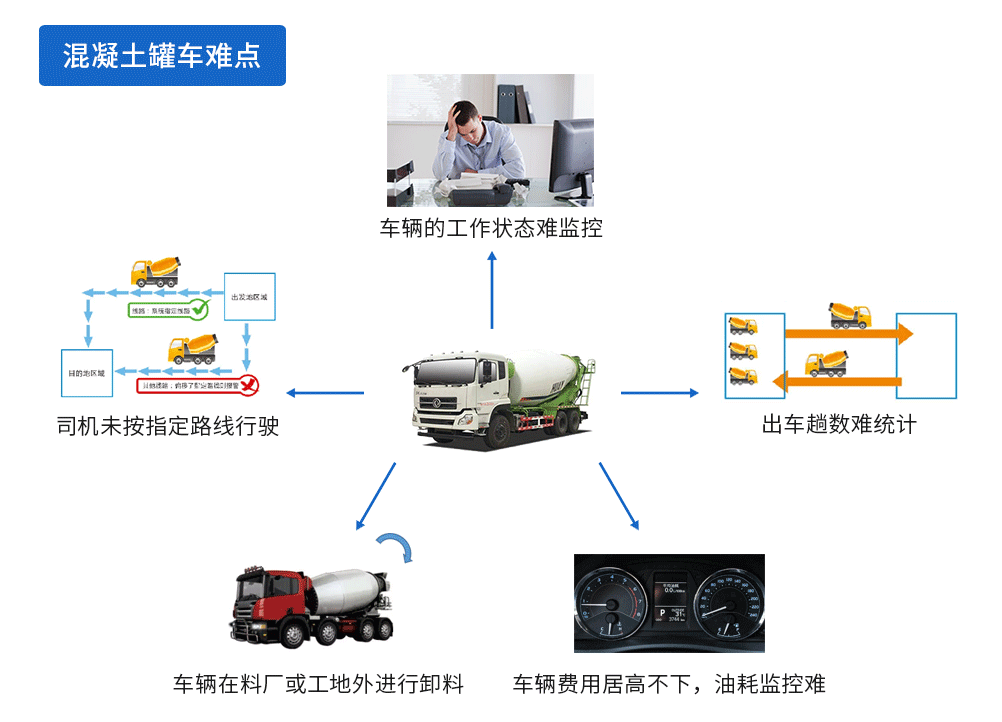 传统的工程车队,如混凝土罐车、渣土车、土石方车队等,在管理过程中通常会遇到以下问题: