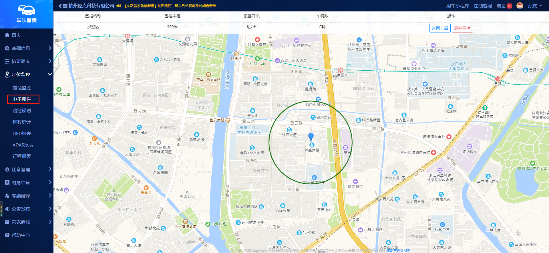 ■ 场景:管理员通过电子围栏安排车辆在指定区域内作业,若车辆超出预设好的半径,系统将报警提醒管理员。 ■ 端口:电脑PC端。 ■ 功能:定位监控、路径规划、智能报警功能。