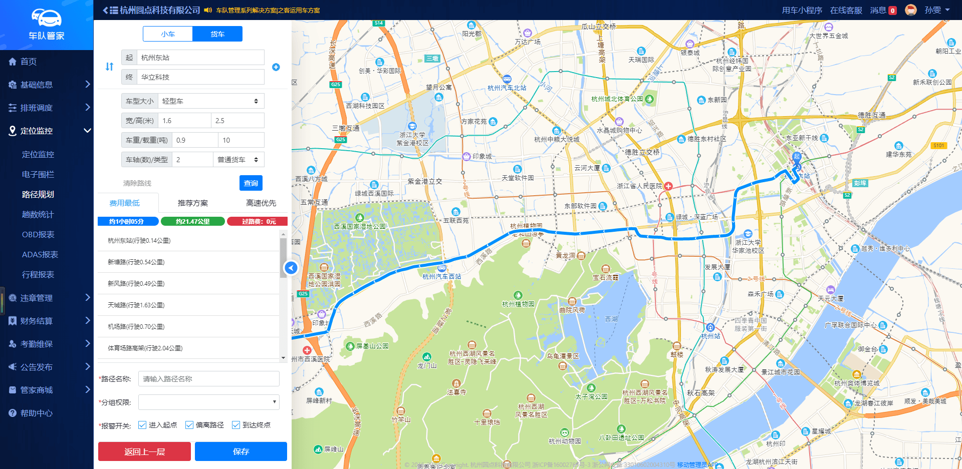 场景:由于部分路段有限高、限宽要求,以及过路费用不明确等问题,管理员可以在监控页面设置货车信息,系统将自动生成3种路径规划方案,您可择优选择。 路径:管理员网页端--定位监控--路径规划--添加路径--货车