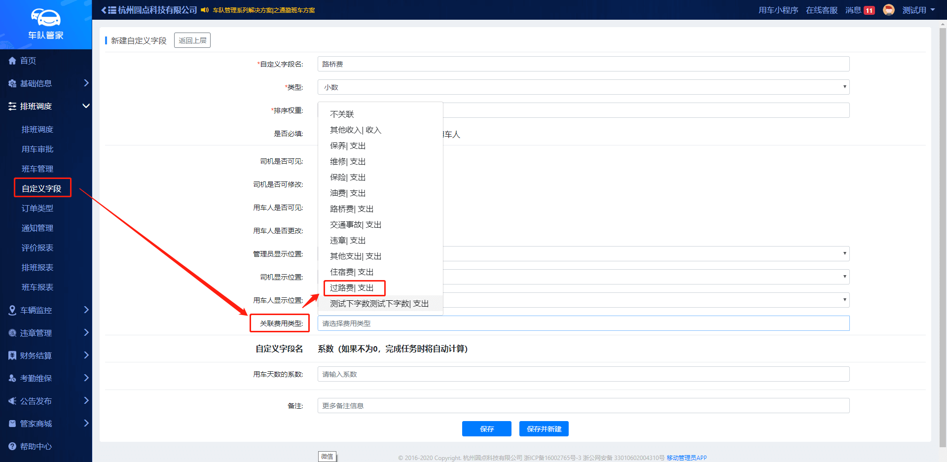 场景:管理员新增有关费用的字段名,并添加关联费用类型,排班任务完成后,系统将生成相关费用类型的账务费用记录。 路径:管理员网页端--排班调度--自定义字段--添加自定义字段--关联费用类型