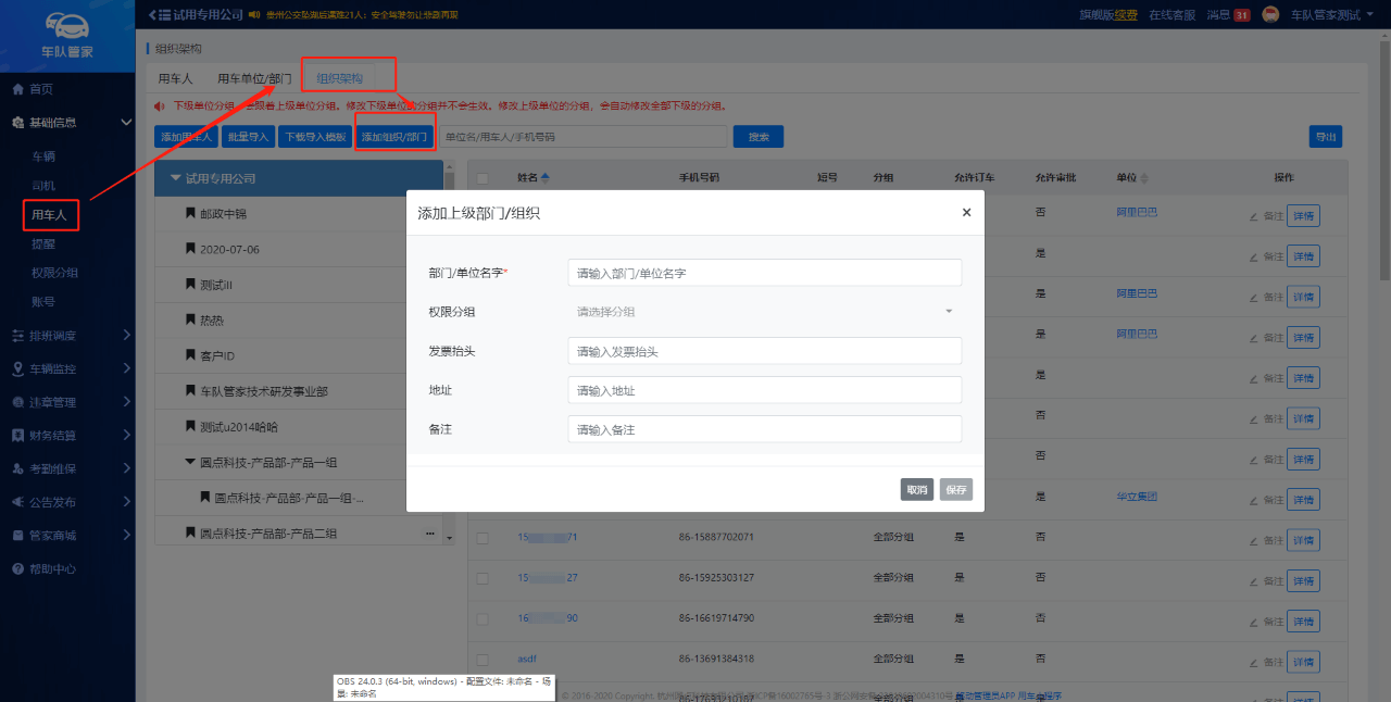 场景:管理员可在用车人列表中,添加组织架构。根据单位部门分类进行添加,同时后台支持企业微信数据导入,自动生成组织架构。