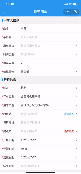场景:用车人在下单时,起点站/终点站可从历史记录中进行选择。