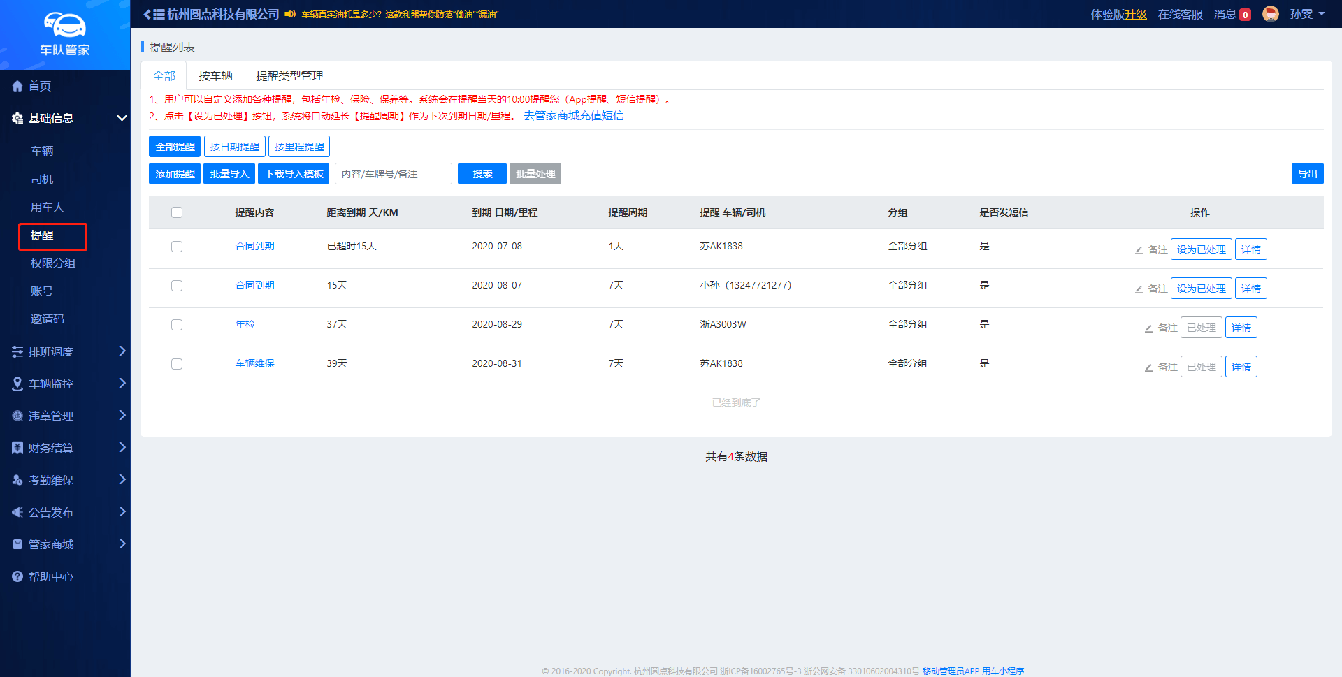 利用车队管家的提醒功能,设置车辆各项保养、保险、年检等提醒的到期时间,避免车辆长期不保养产生车漆年久、轮胎爆胎乃至起火等风险。