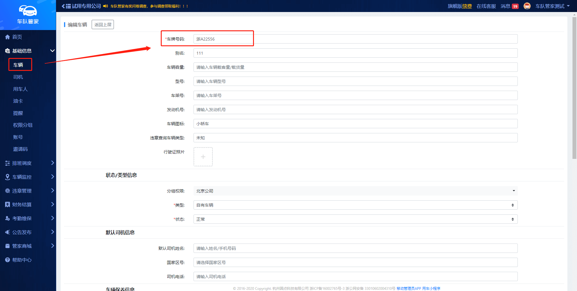 管理员需要在“基础信息”模块中添加车辆,输入正确的车牌号。