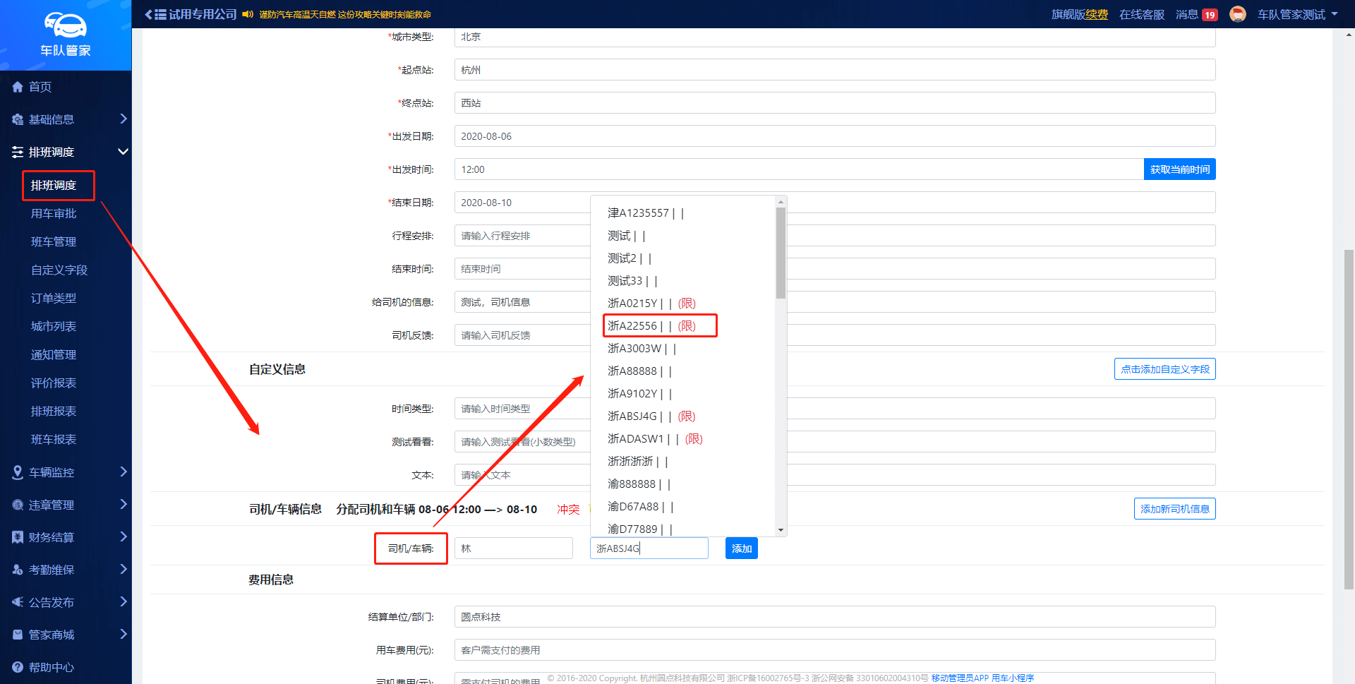 管理员在添加排班调度时,输入任务时间,系统将依据当地城市限号政策及任务时间,在车辆选择栏的下拉框中显示车辆是否限行。若是限行车辆,系统将自动标注“限”的字样。