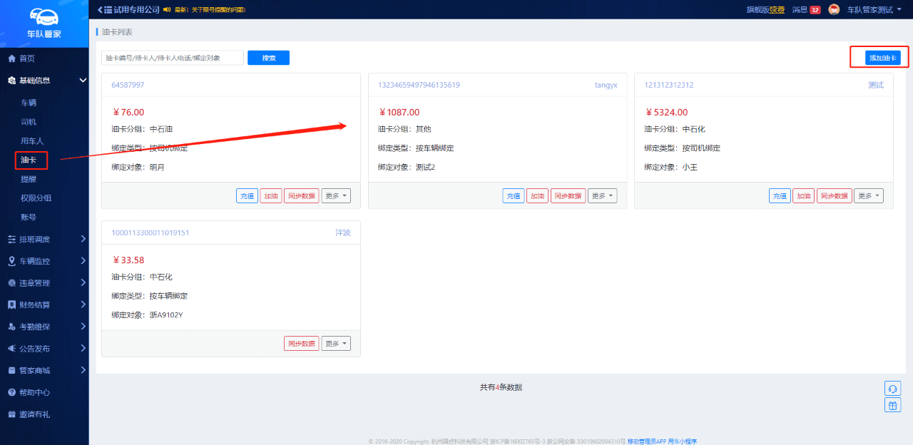 管理员在“基础信息”模块中点击“油卡”,点击“添加油卡”。