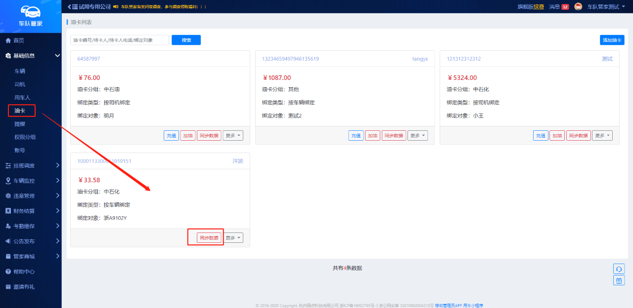 选择对应的中石化加油卡,点击“同步数据”即可免去手动录入的麻烦和错误。每次油卡充值或加油后,管理员只需在后台点击该按钮,更新后台数据即可。