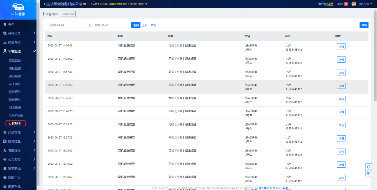 路径:管理员网页端--车辆监控--行程报表--报警明细