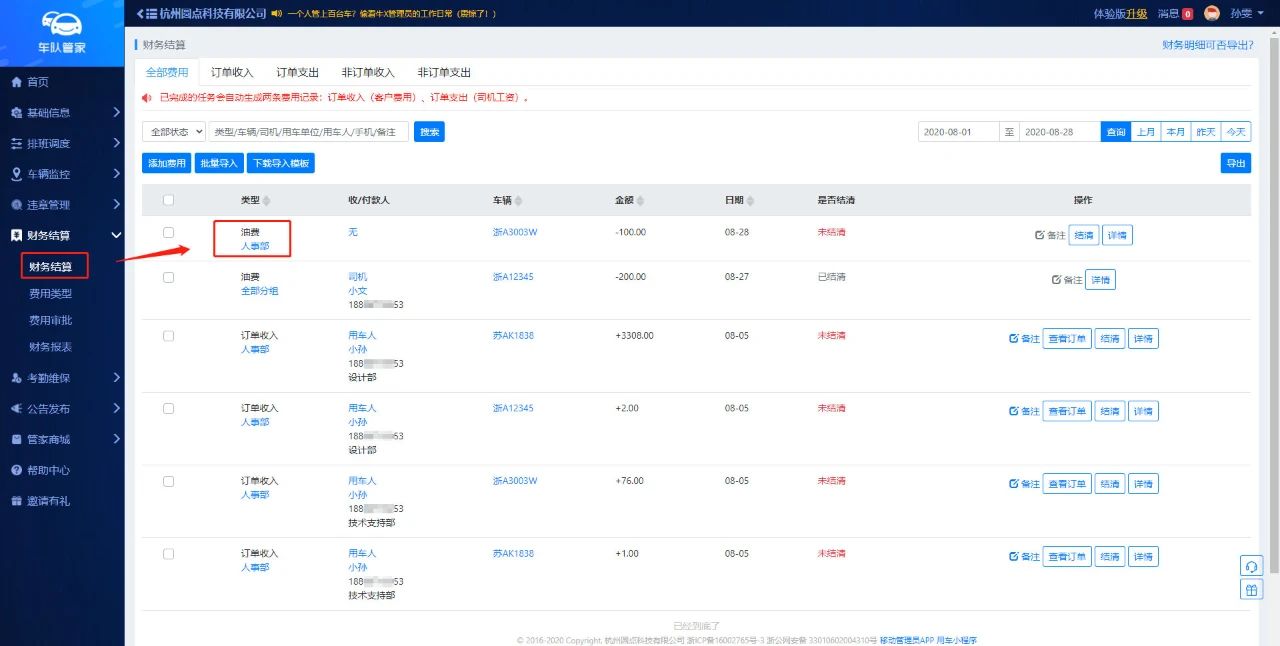 在更新完油卡数据后,后台将实时同步至财务模块,管理员无需手动添加油耗相关费用,实现油耗自动管理。