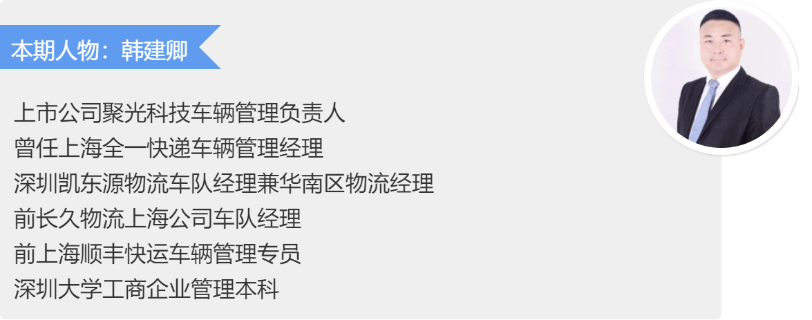 韩建卿:最多管过2000多辆车,其实车辆多少在管理本质上是一样的,100辆车和1000辆车在管理过程中,最大的差异就是人员配置,如果把车辆管理过程中涉及到的规则整理清楚并进行分析,就能保证专业性,管理2000辆车也并非什么难事了。
