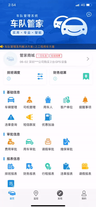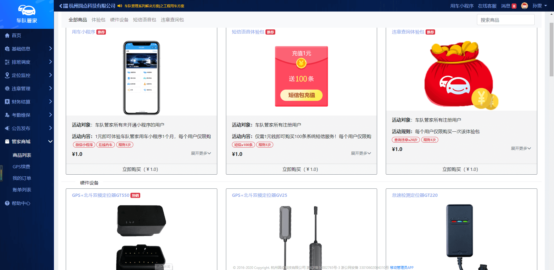 管理员登录APP点击进入管家商城。现有商品包括:体验包、短信语音包、违章查询包、硬件设备以及系统软件服务等。