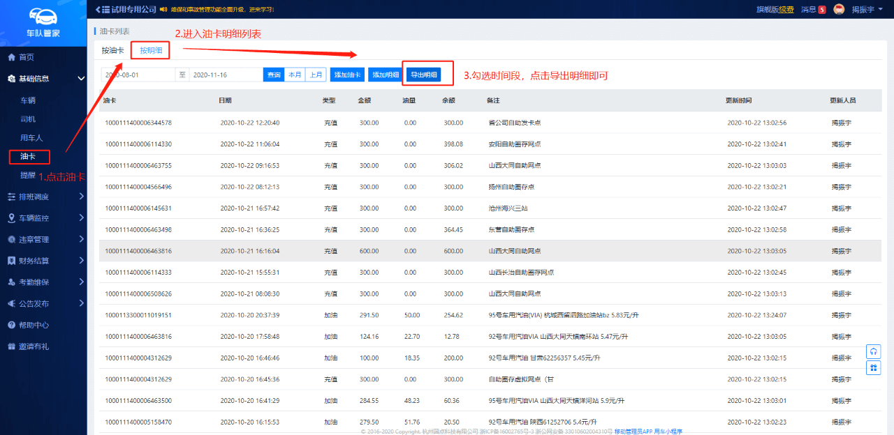 通过系统生成的油卡消费明细,详细地展示出消费类型、金额、备注及更新人员等相关数据,并支持一键导出。
