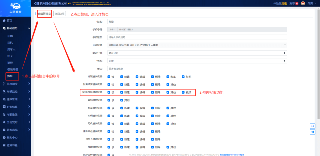 超级管理员可在后台设置其他管理员的功能权限,包括在线查看车辆视频监控画面,避免消耗过多流量。