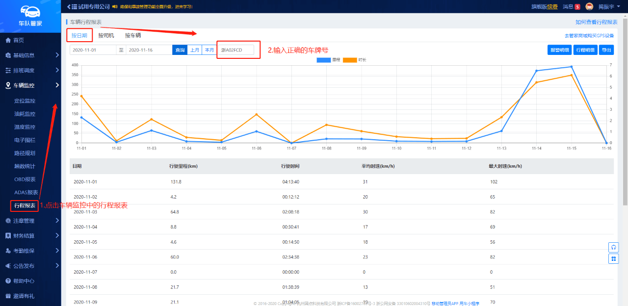 管理员在查看行程报表时,后台支持一键查询指定车辆的行程明细,包括行驶里程、时间,平均时速及最大时速的相关数据。