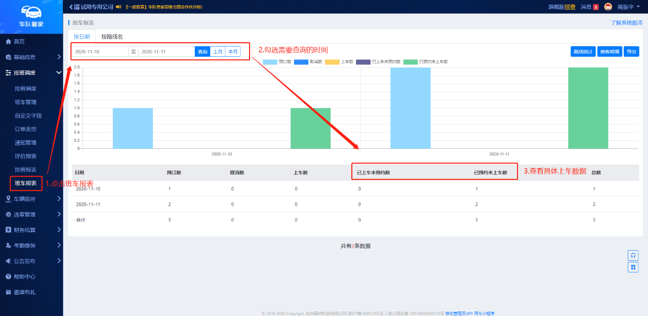 班车任务结束后,系统自动生成已上车未预约数及已预约未上车数,管理员可以通过报表轻松掌握每个班次的上座率,后期合理安排车辆。
