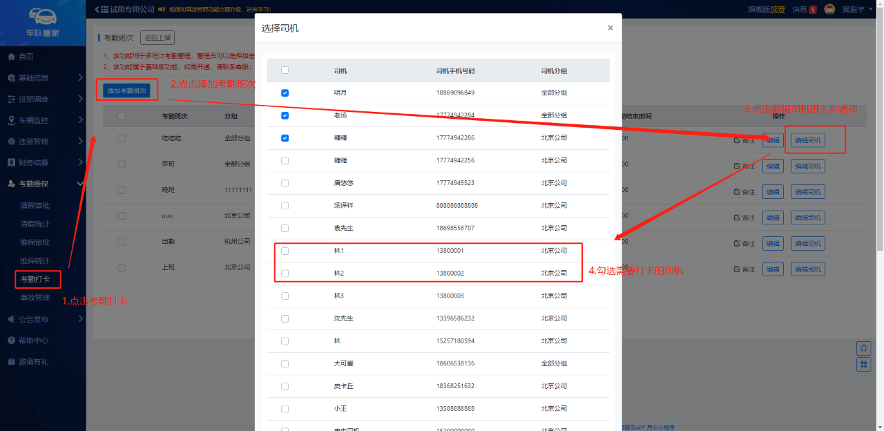 管理员在编辑考勤打卡时可添加多个司机,支持同个司机打卡多个班次,实现司机早晚班打卡。