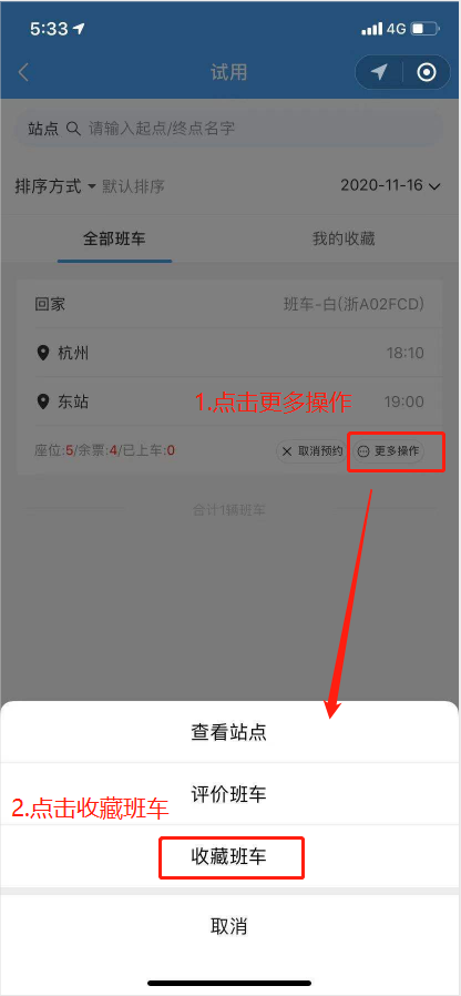 单位班车较多的情况下,用车人可在后台一键收藏班车,方便后期用车人直接进入“我的收藏”快速预约座位。