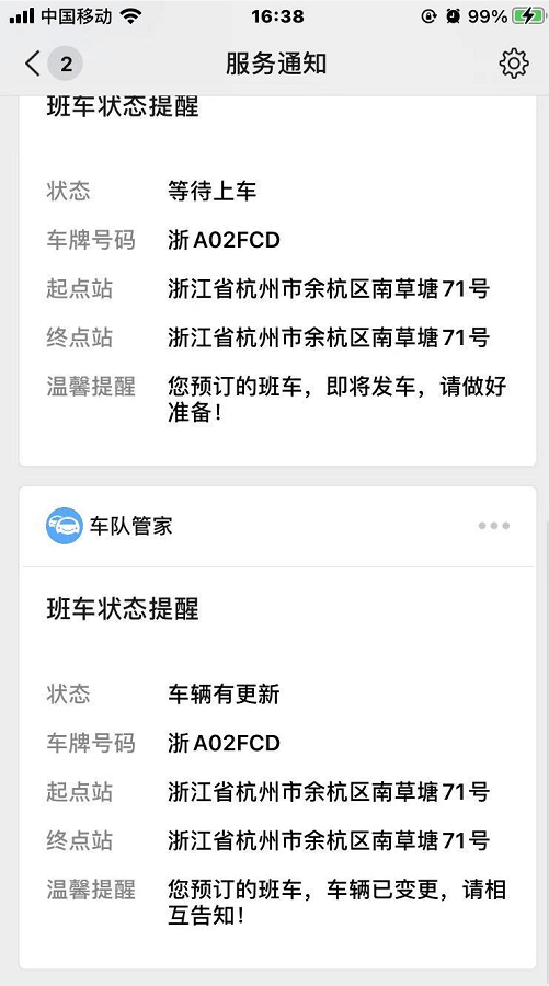 班车预约成功后,在车辆出发前30分钟,系统将自动通过微信提醒乘车人班车状态。