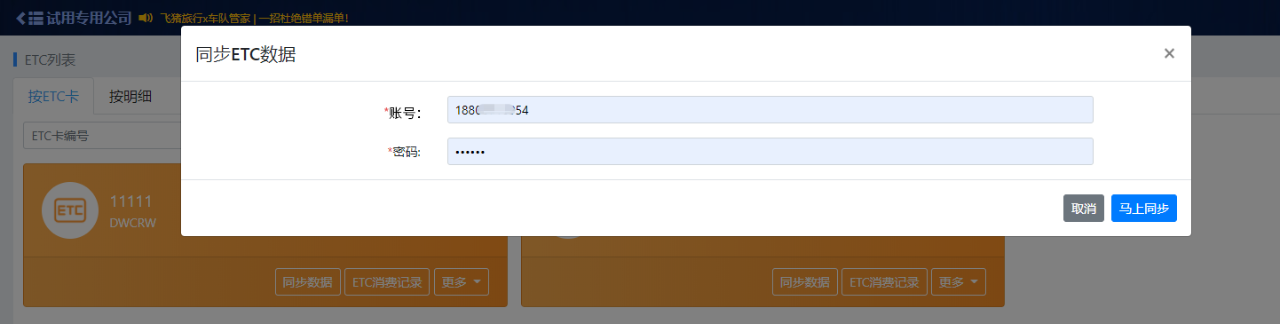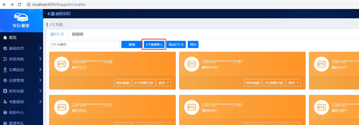 登录车队管家后台,在“基础信息”中找到“ETC”,点击“ETC数据导入”,输入账号和密码,点击“马上同步”,即可同步所有车辆的ETC数据(如下图):
