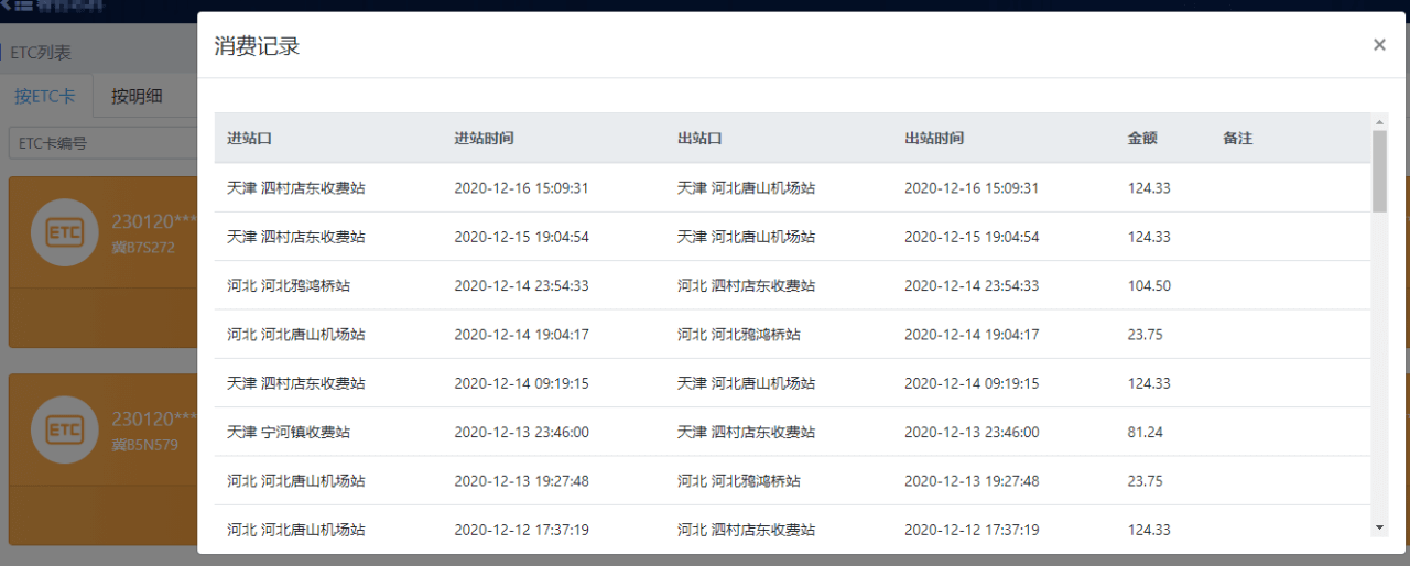 管理员可以通过车队管家后台一键同步ETC官方平台的所有数据,实时监控每一辆车的通行费状况,查看进/出站口明细;