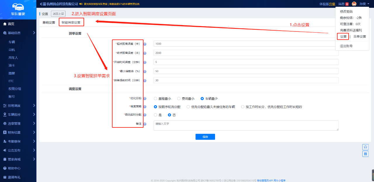 超级管理员登录车队管家后台,点击右上角“设置”,点击“智能调度设置”,根据单位的优化目标,配置智能调度(如下图):