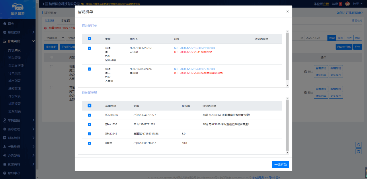 管理员进入“排班调度”页面,点击“智能拼单”,在“智能拼单”页面中,管理员可勾选全部选项,系统会根据智能调度设置自动对未安排车辆/司机的订单进行合理拼单。(如下图):