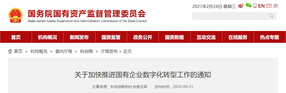 近日,国务院国资委正式印发《关于加快推进国有企业数字化转型工作的通知》,系统明确国有企业数字化转型的基础、方向、重点和举措,开启了国有企业数字化转型的新篇章,积极引导国有企业在数字经济时代准确识变、科学应变、主动求变、加快改造提升传统功能、培育发展新动能。