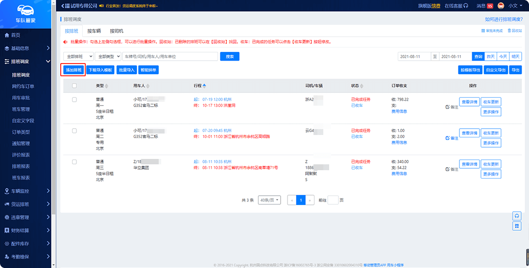 通过『排班调度』功能,调度员可直接添加调度任务,创建完成后,司机会通过司机APP接单。