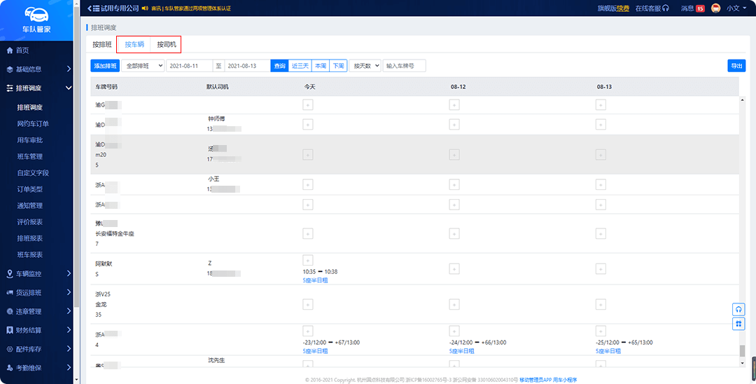 03 | 指定司机/车辆,按需创建调度员在『排班调度-按司机/车辆』功能下,可选择安排指定空闲中的司机/车辆进行派单。