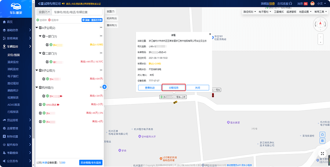 凡是已安装定位监控设备的车辆,调度员在『车辆监控』页面可查看当前车辆的任务状态,在地图上选择空闲中的车辆,点击“分配任务”,即可就近派单。