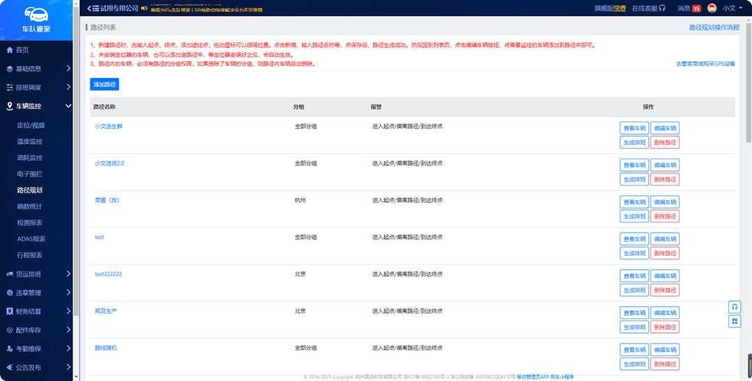 针对清扫车、渣土车等长期在同一固定路线行驶的车辆,调度员可手动创建新的路径,或者指派已安装定位设备的车辆按路线行驶,生成行车轨迹。