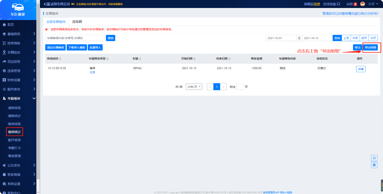 为方便统一管理维保项目,管理员在后台可以批量导出维保明细,全面提升数据的利用价值。