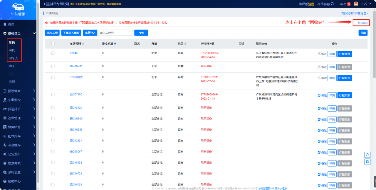 信息不小心删除怎么办?现「车辆」「司机」「用车人」模块中删除的信息支持快速恢复,管理员只需在回收站中一键操作即可。