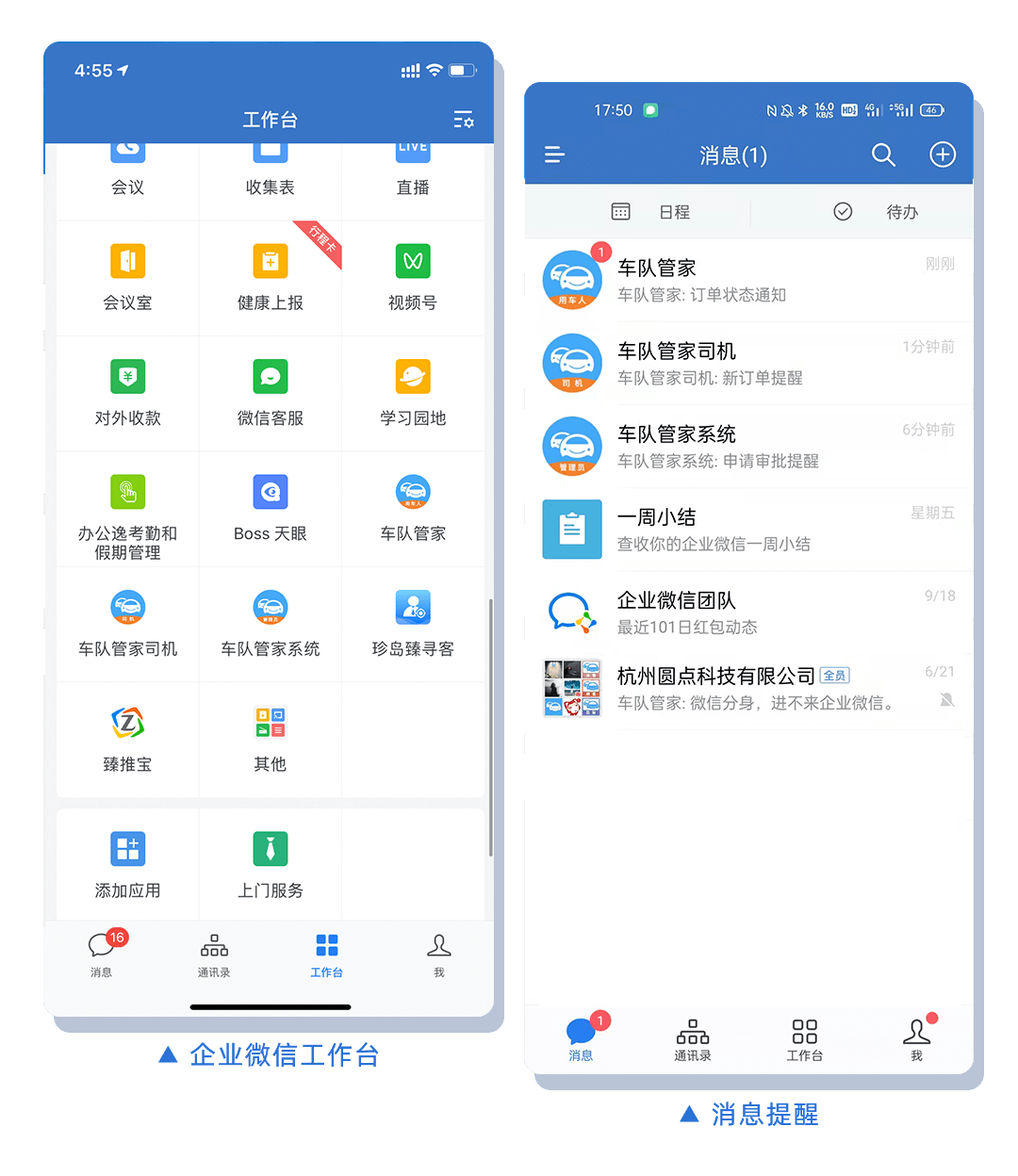 为了提升企业员工工作效率,现车队管家消息提醒已联动企业微信后台,用车人、管理员、司机可及时接收订单通知,用车进度轻松知晓。