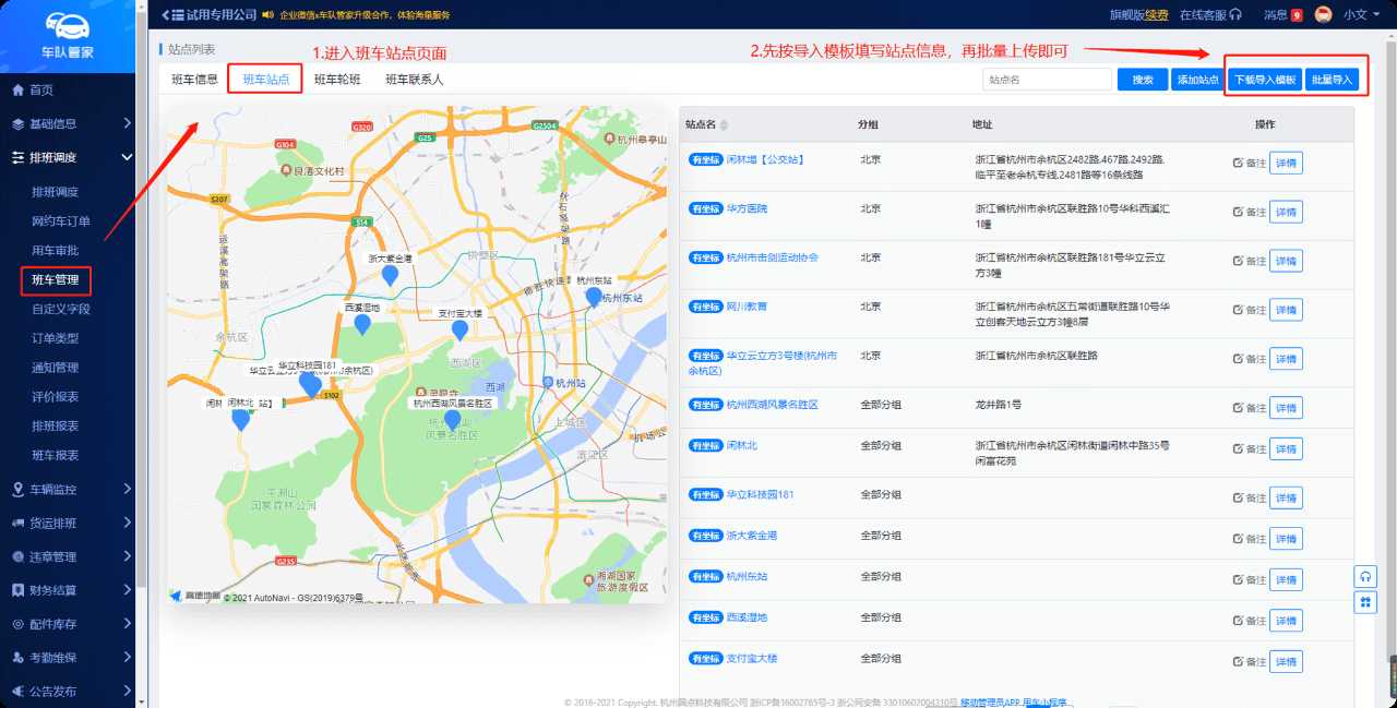 为方便管理员做好站点管理,管理员可在「班车管理」中批量导入班车站点,系统会根据站点名称解析经纬度。